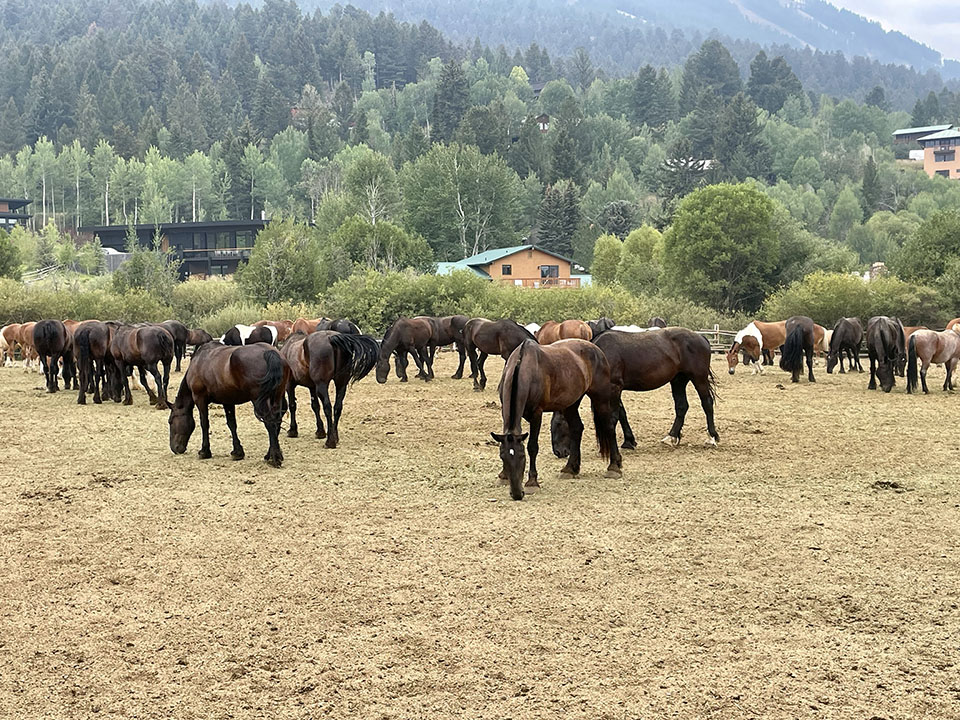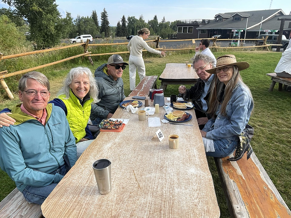 One of our Jackson traditions is eating at old family favorites, like The Calico (the original JH pizza joint, now very much upscaled), and Dornan’s Cowboy Chuckwagon, in Moose, with all-you-can-eat sourdough cakes, eggs, and bacon, outdoors under the Grand Tetons. (Heidi had to bring her own breakfast, but everyone else loved it!) They also have fantastic gluten-free pizza in their pasta/pizza bar across the parking lot, so Heidi was happy about that.
