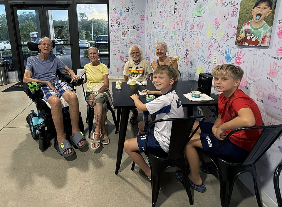 Although he was no longer able to do much of anything—only be an observer of what was going on around him—amazingly, Galen was still able to drive his motorized wheelchair out of the house, and up the ramp into their wheelchair accessable van (no doubt, using his years of airline piloting experience.) We took him out to visit with a few of their friends. Big thanks to Tammy for your delicious homemade sourdough bread! And what a fun evening with our great-nephews, Mav and Ky, getting pizza and ice cream together.