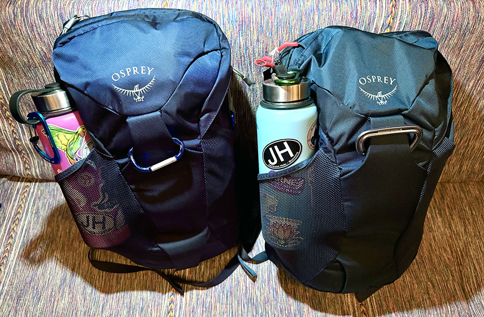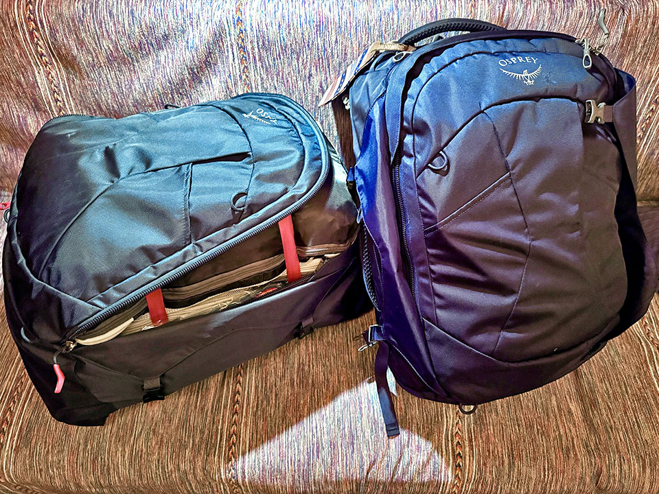 Our “his and hers” 40-liter Osprey carry-on packs (with pack straps tucked inside) and matching “piggybacking” day packs that attached to the carry-ons, so we could easily carry everything on our backs. We were concerned these would be too small for 5-weeks of travel, but they ended up being fine. However, we did have to purchase an extra suitcase for our return, full of gifts and souvenirs!