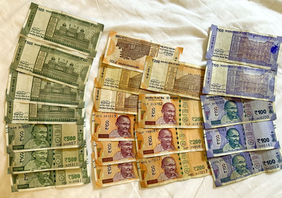 Athma Tours advised to bring USD with us to exchange at the hotels. Some hotels have better exchange rates than others. ATMs were less convenient where we were going, so this worked out fine. As with so many other countries, India’s money is beautiful and colorful! This is about $65 USD.