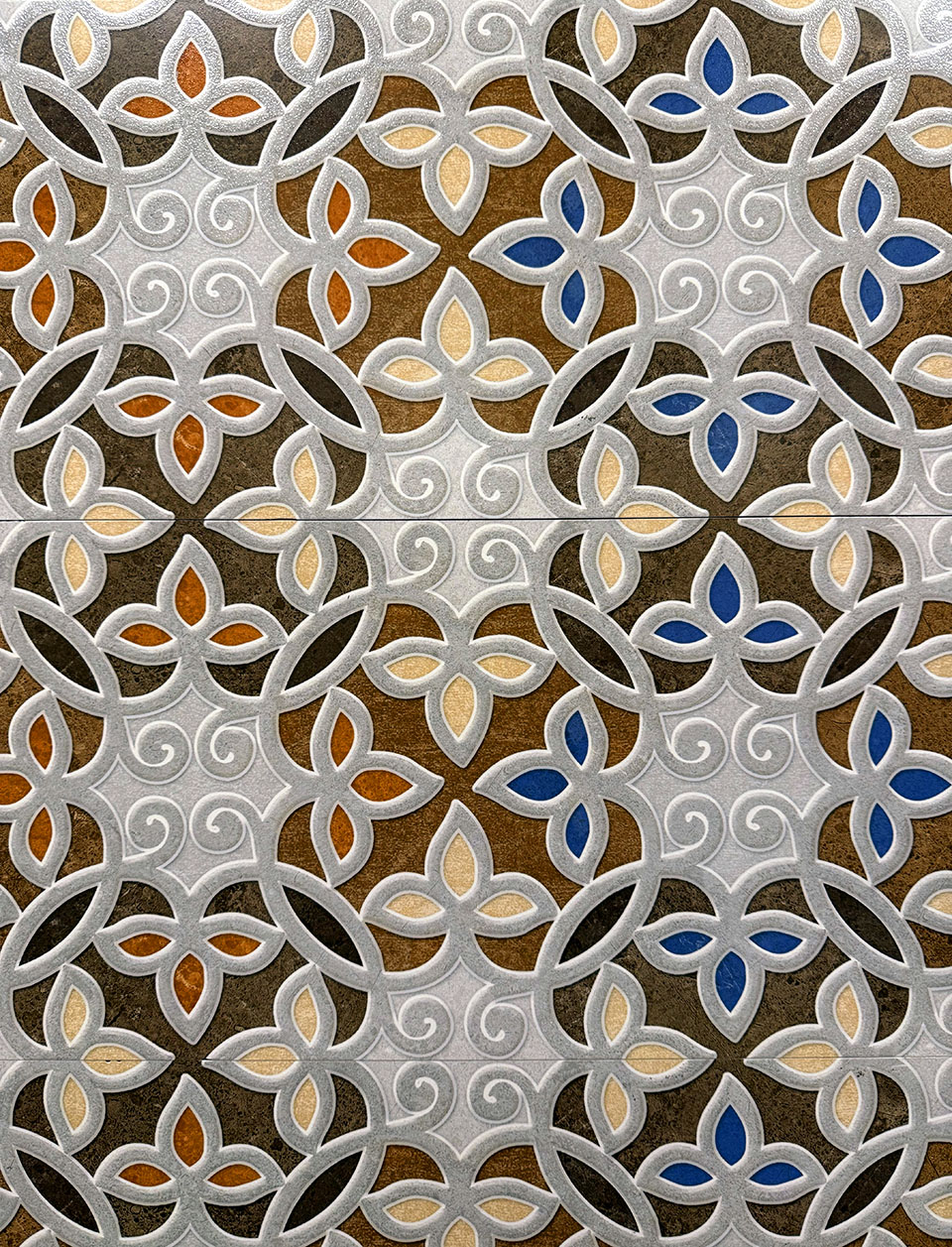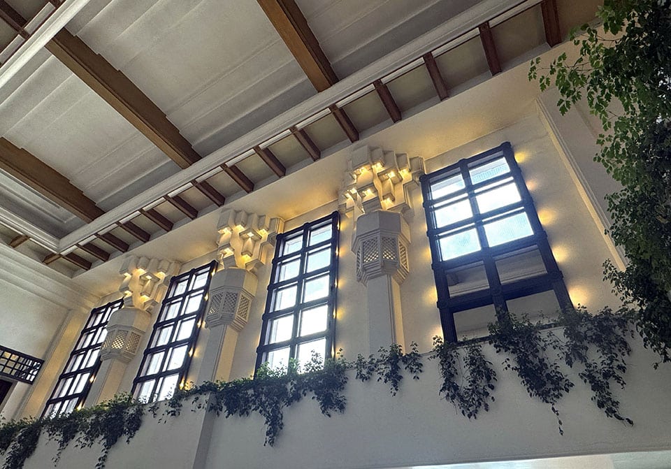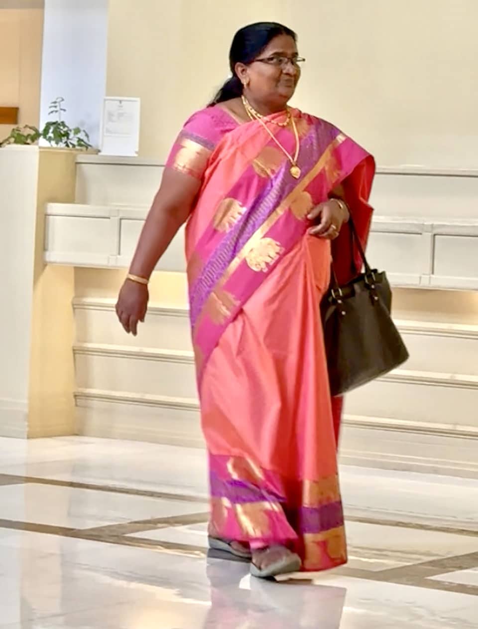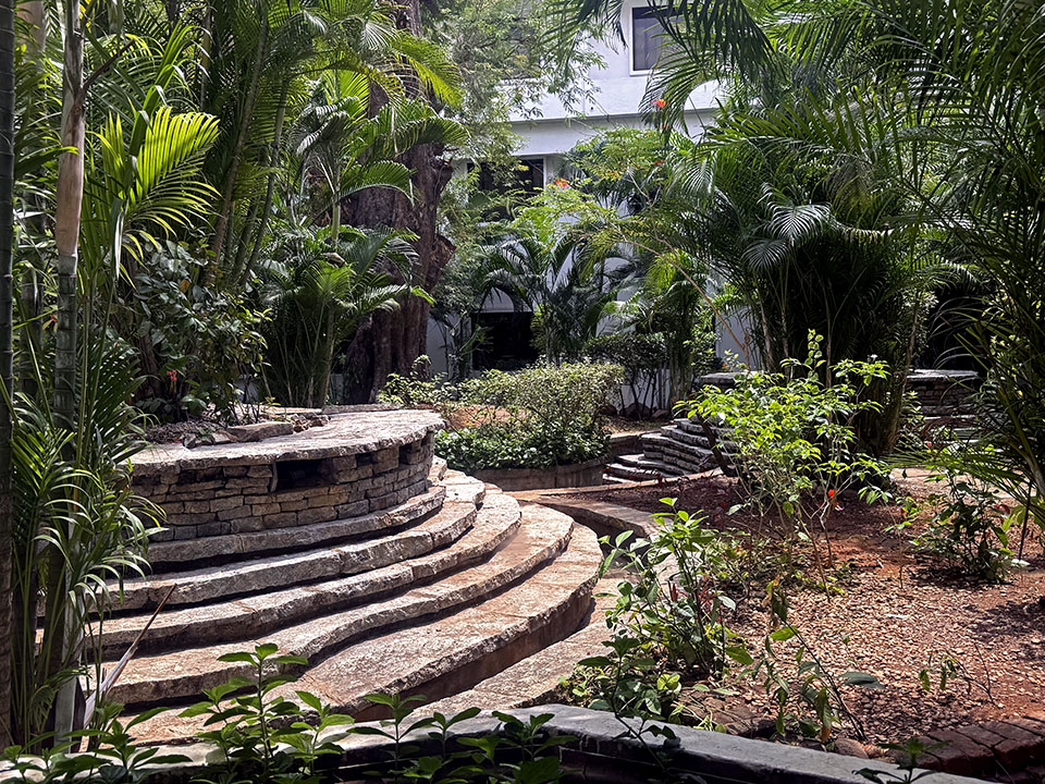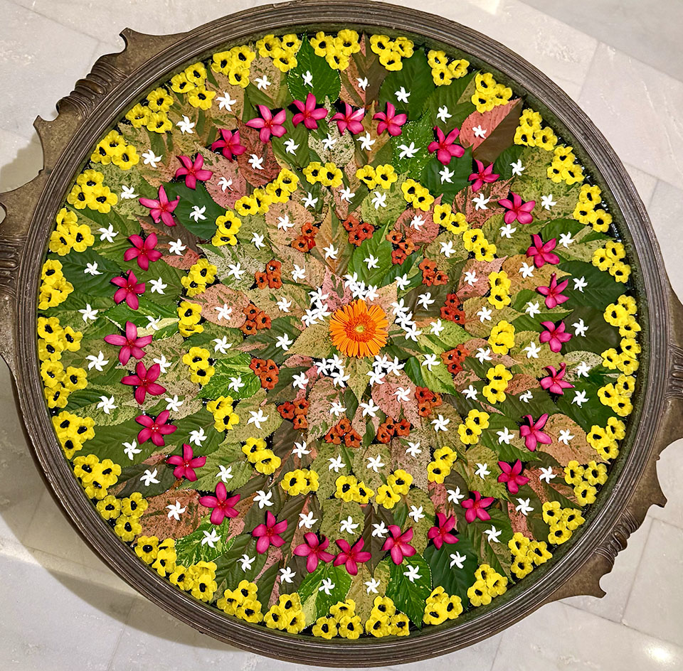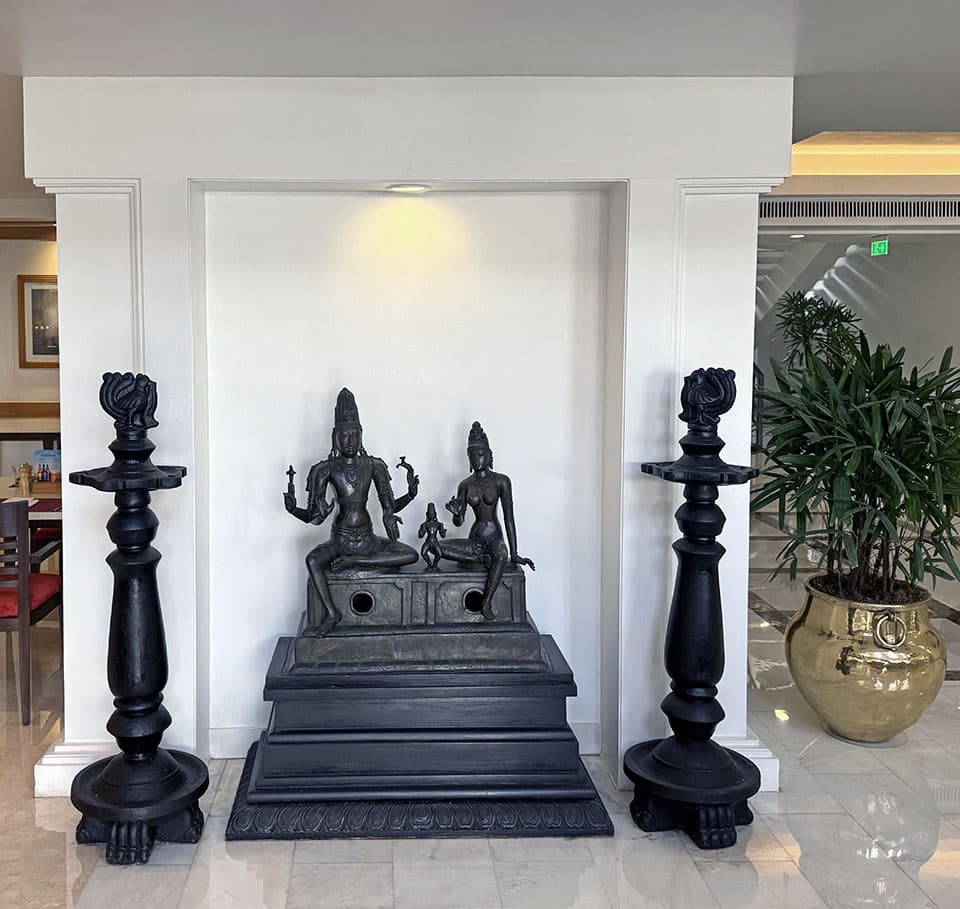 We were greeted in the hotel lobby at 3 AM by the Marvalous Mallika, our wonderful tour guide/organizer extraordinaire— and always dressed in gorgeous saris! The hotel lobby was decorated with beautiful fresh flower mandalas, floating in bowls of water. What fun it would be to create those every day! This 160+ room hotel on five acres of landscaped gardens had lots of interesting art and architecture.