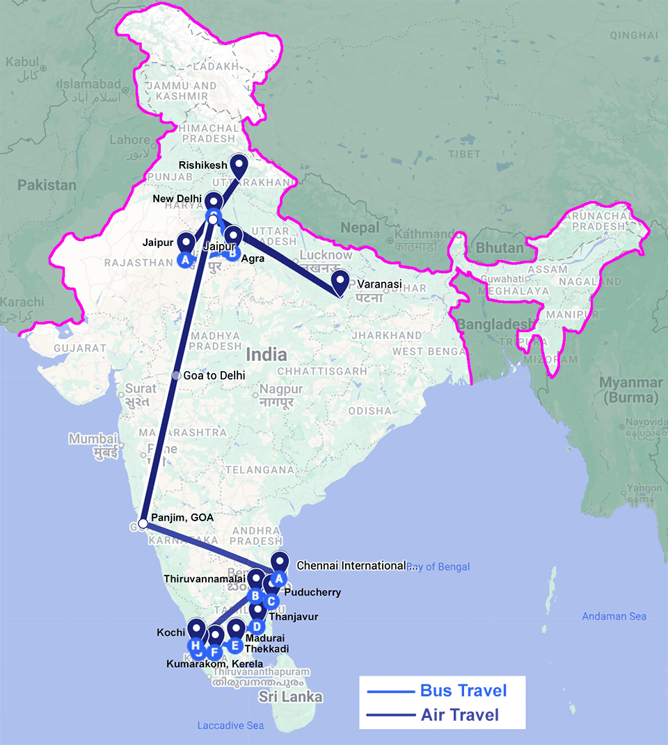 Trying to figure out airfare was another feat in itself. Once we landed in India, Roger‘s friends at Athma Tours (Jai [“Jay”] and Mallika) took care of everything for us, including local transportation and lodging within India. But for purchasing airfare between Mexico and India, we were on our own.
