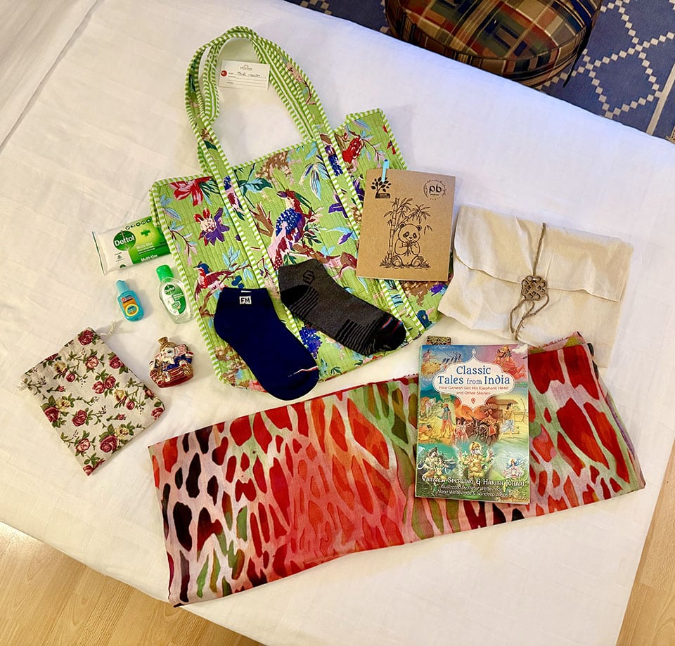 Mallika gifted lovely quilted Indian tote bags to each of us as we arrived, stuffed with useful items for our trip (toilet paper, hand wipes, hand spray, mosquito repellent, socks for visiting temples where we have to remove shoes) as well as beautiful gifts to remind us of our India trip (cashmere shawls, a book of Hindu mythology, porcelain sculpture of Ganesha (the Hindu Indian elephant god “remover of obstacles” because who doesn’t need some obsticles to be removed?), and more.