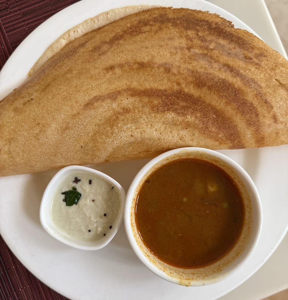 The delicious buffet food at the restaurant was also conveniently marked with food allergens, so Heidi could easily figure out what to eat (sadly, none of the beautiful desserts). Sabudana Vada (below left, savory tapioca and peanut morsels) is now a new favorite; we’ll have to learn how to make this at home! We also loved the dosas (below middle, rice flour crepes with spicy lentil sambar and coconut chutney).