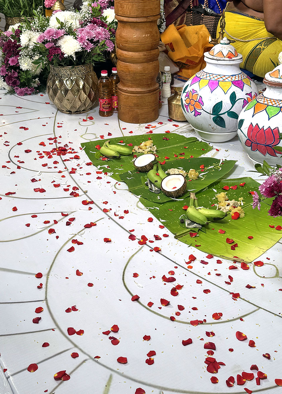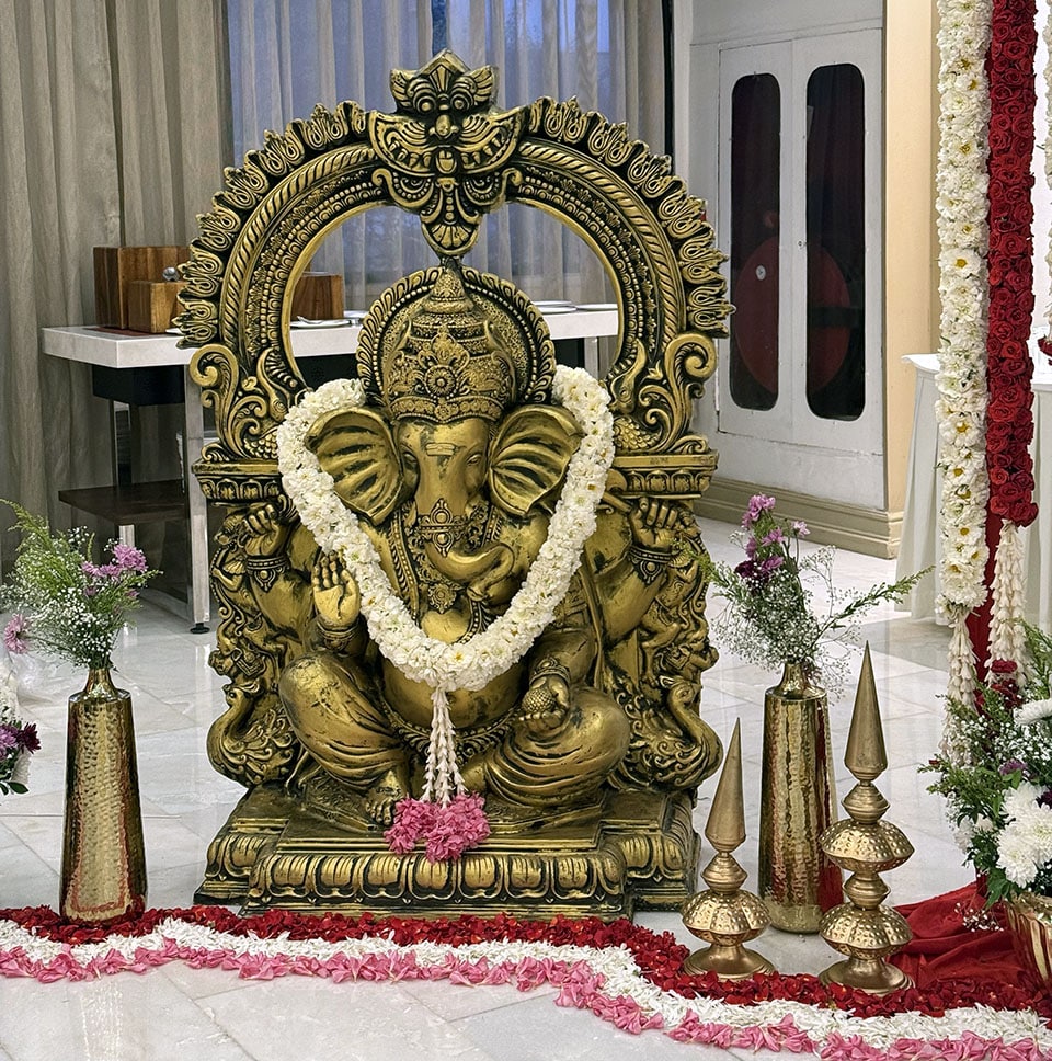 Top left: Ganesh, the Hindu elephant god, “Remover of Obstacles”, Top right: a close-up of the wedding stage with fruit and flower offerings, Bottom: The whole wedding shrine was decorated with fresh flower garlands that smelled divine.